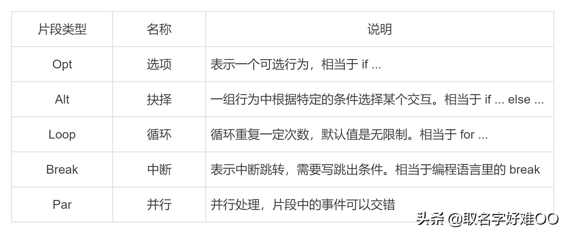 组合片段用来解决交互执行的条件和方式,为任何生命线的任何部分定义特殊条件和子进程。这里只列举了我们常用的 5 种(共有 13 种)名称及含义如下: