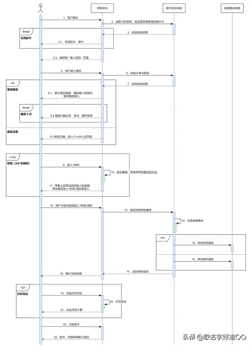 场景:用户去「存取款机」存钱 (虚构的流程别太当真)绘制步骤可简单总结如下:1、划清边界,识别交互的语境 - 界定好要画的范围,是业务场景还是代码执行过程2、梳理角色和对象 - 将所要绘制的交互场景中的角色以及对象梳理出来,本例中有四个角色对象:用户、存取款机、银行后台系统、消息推送系统,注意命名不能用动词3、添加消息 - 从触发整个交互的某个消息开始,在生命线之间从上到下依次画出所有消息,并注明每个消息的特性(如含义、参数等)