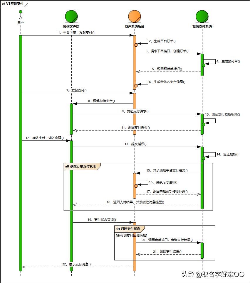 它是从人与系统的角度来描绘整个处理流程,主要描述了正常的流程(实际上里面还有很多异常处理需要考虑)参与的角色和对象有:用户、微信客户端、商户的后台系统、微信的支付系统在第 15 步,使用了一个异步回调的画法第 6 步之后,没有返回消息(感觉还是要加一下,返回支付信息并弹出确认支付界面)alt 组合片段没有描述条件(感觉有点问题)