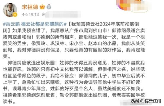 12月10日,宋祖德发文声称:“郭德纲率领一帮中小学毕业生玩传统文化,脱了裤子取悦观众,讲些低俗不堪的段子侮辱观众的耳朵,这是糟蹋传统!郭德纲最大的智慧就是擅长砸钱炒作,还用同样的炒作手法去炒作儿子郭麒麟,误导青少年不读书也能赚到钱,这是千古罪人,早晚会害了儿子!”除此之外,宋祖德还发文预言:“德云社将在2024年前彻底倒闭,如果我预言错了,我愿意从广州爬到佛山市!”此言一出,立刻引起了网友们的热烈讨论。