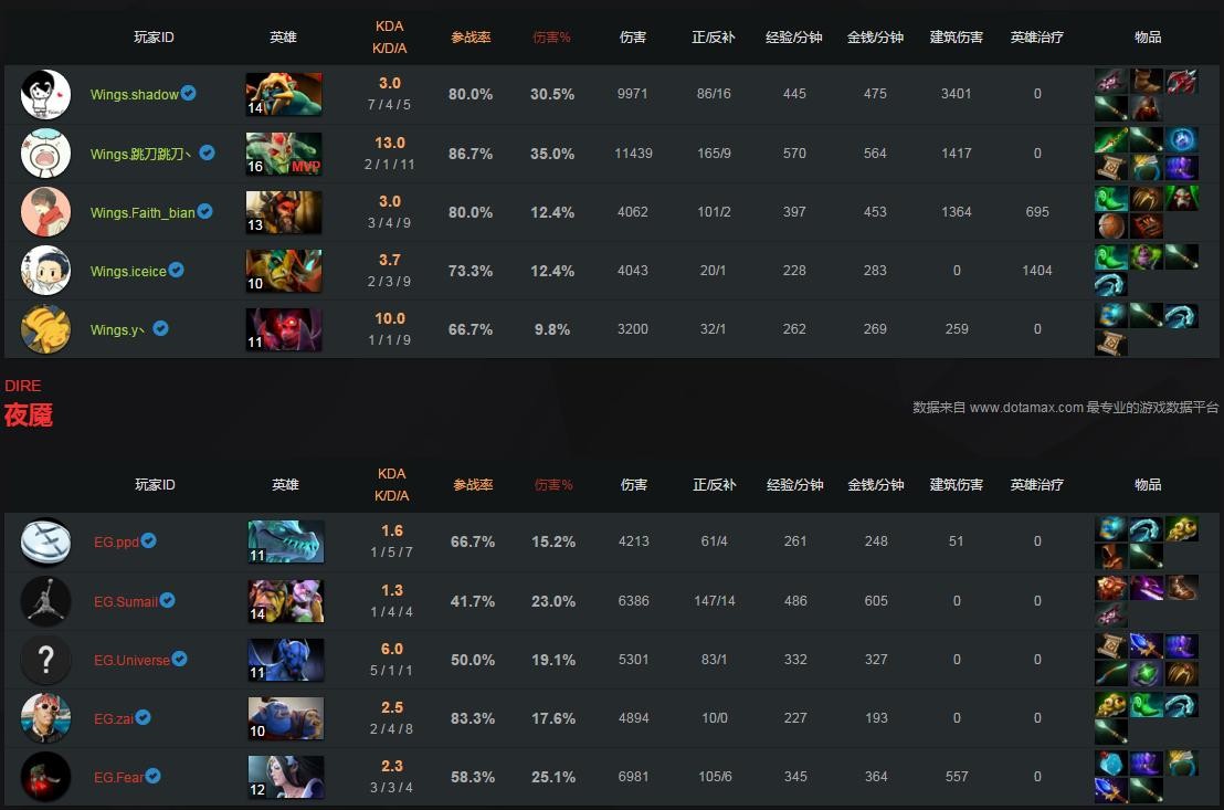 36分钟,Wings开推中路高地,iceice谜团后手大拉了三人秒杀敌法!苏少摇大面对梅肯挑战也打不出多少输出!37分钟,Wings佯装撤退,掉头反击又杀了收线SumaiL。夜魇中路高地沦陷。38分钟,Wings再推下路高地,伐木机双轮盘秒了买活的Zai妹。苏少复活还是没能收割掉任何人,敌法开出BKB刚不过一个经济领先他一个大件的剃刀,EG再被团灭打出GG。