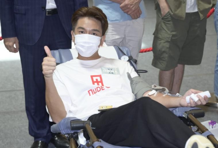 马国明与胡定欣为了呼吁大家捐血,他们身体力行,即场挽起衣袖捐血,献出爱心。