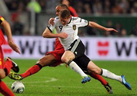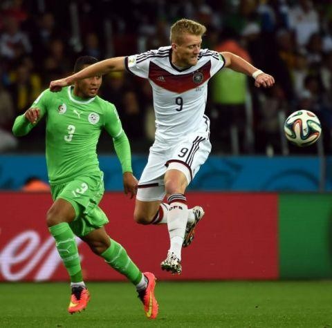 7月17日,德国前国脚、29岁的边锋许尔勒通过德国媒体《明镜周刊》宣布了自己退役的决定。图为2014年6月30日,德国队球员许尔勒(右)在比赛中进攻。