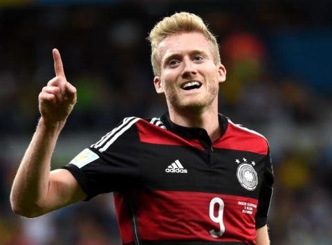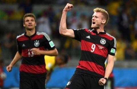 2014年7月8日,在巴西贝洛奥里藏特的米内罗大球场进行的2014年巴西世界杯半决赛中,德国队球员许尔勒庆祝进球。最终,德国队以7比1战胜巴西队,晋级决赛。