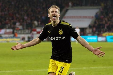 2018年2月2日,在2017-2018赛季德国足球甲级联赛第21轮对阵科隆队的比赛中,多特蒙德队球员许尔勒庆祝进球。 最终,多特蒙德队客场以3比2战胜科隆队。