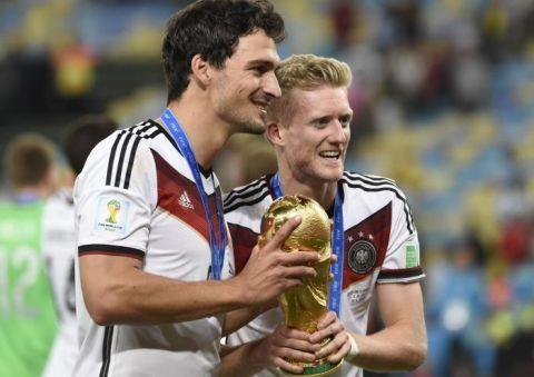 图为2014年7月13日,在巴西里约热内卢马拉卡纳大球场,德国队球员许尔勒(右)与队友胡梅尔斯在2014年巴西世界杯颁奖仪式上手捧“大力神杯”合影庆祝。