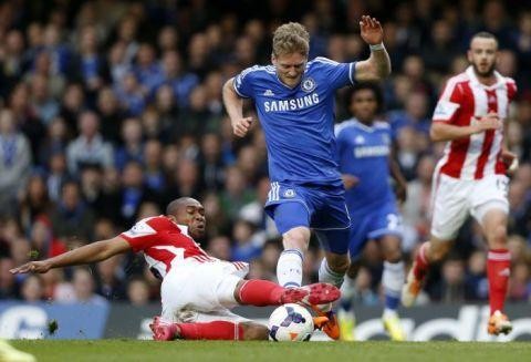 2014年4月5日,在伦敦斯坦福桥球场举行的2013-2014赛季英格兰足球超级联赛的第33轮比赛中,切尔西队球员许尔勒(左二)与斯托克城队球员帕拉西奥斯拼抢。最终,切尔西队主场以3比0战胜斯托克城队。图/新华社 声明:转载此文是出于传递更多信息之目的。若有来源标注错误或侵犯了您的合法权益,请作者持权属证明与本网联系,我们将及时更正、删除,谢谢。( 文章来源:北青网)