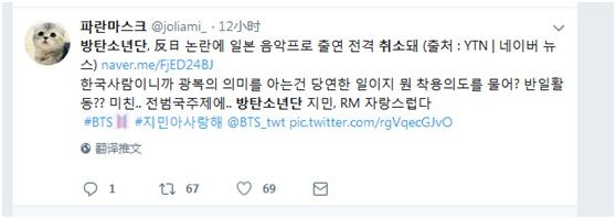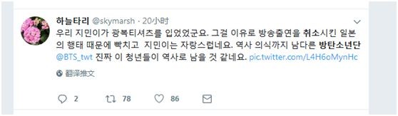 网友하늘타리:我们智旻穿了光复T恤啊。因为这样的理由被取消了在日本的演出,为智旻骄傲。防弹少年团果然从意识上都和别人不一样。感觉这些青年能在历史上留名。