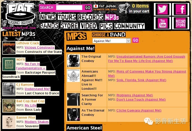 对于喜欢朋克音乐的朋友来说,Fat Wreck Chords网站绝对是他们的福地。这里都有很多精选、分类的朋克音乐。通常你还能找到一张CD里的两到三首完整的曲目。