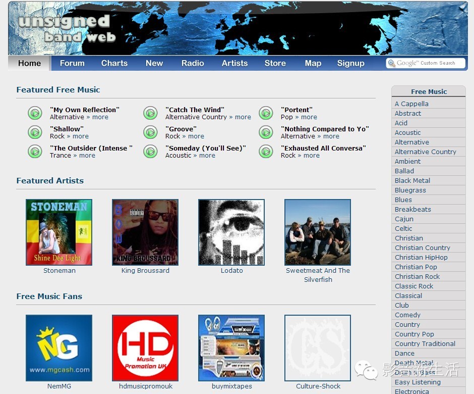 Unsigned Band Web是一个让那些出色却不怎么出名的乐队分享他们音乐并引起界内注意的地方。他们不但制作榜单展示热门曲目,更神奇的是几乎你能相像得到的音乐风格在这里都能找到。在这里看来显然电子乐很流行。也许笔者还是会坚持按风格进行浏览,不管怎么说这里有“好几吨重”的免费mp3可以下载。