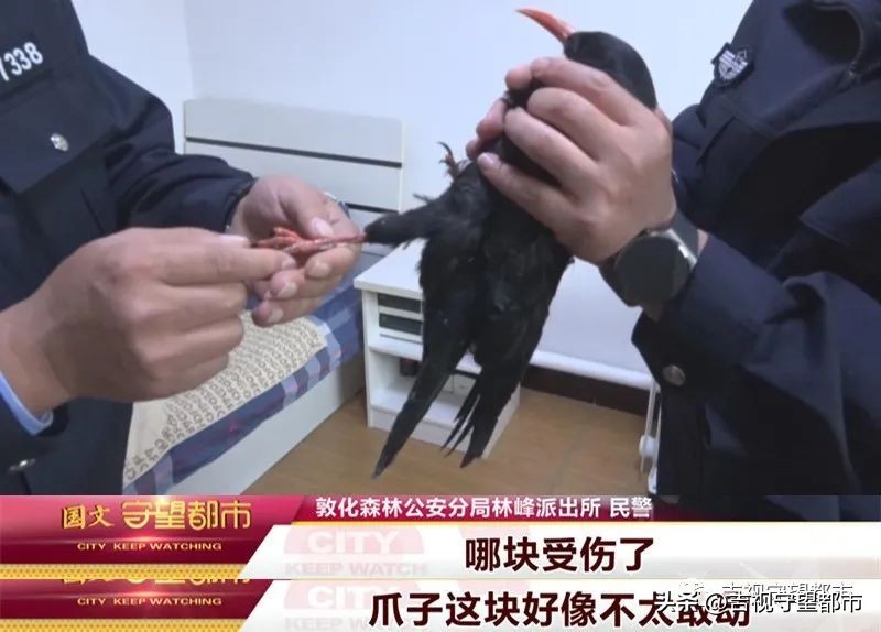 我们赶快就赶到了现场,把这只鸟抓住了,带回了我们派出所。联系林业局动保部门,发现这只鸟叫红嘴山鸦,它是国家二级保护动物,也是国家三有保护动物。