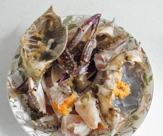 第2步、去除掉蟹腮、蟹心、蟹肠、蟹胃等不可食用的部位。