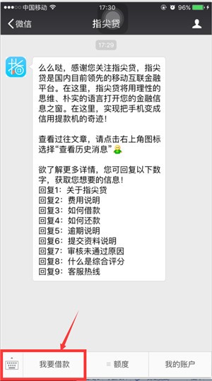 二、“指尖贷”公众号会发来一条消息,点击进入指尖贷微信公众号界面,