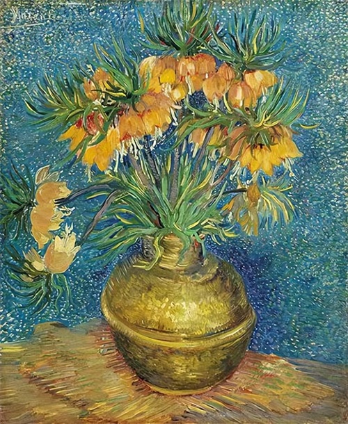 这幅《铜花瓶上的皇冠贝母》,是梵高受到印象派的影响,开始尝试新画法的早期作品,蓝色与橙色的对比使画面富有活力。