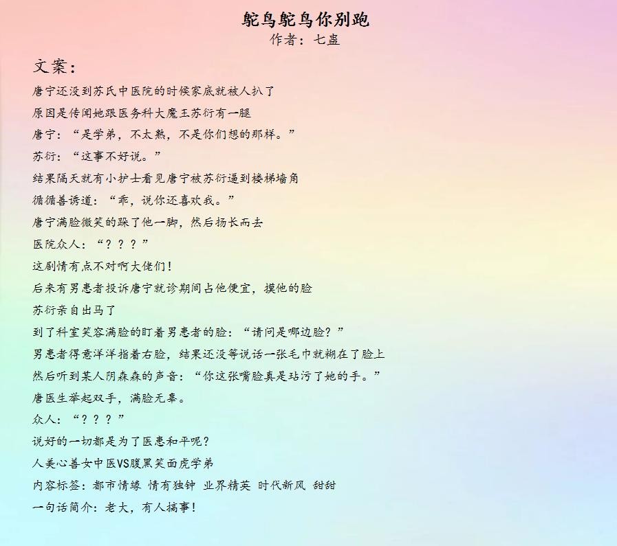7、《鸵鸟鸵鸟你别跑》 作者:七蛊