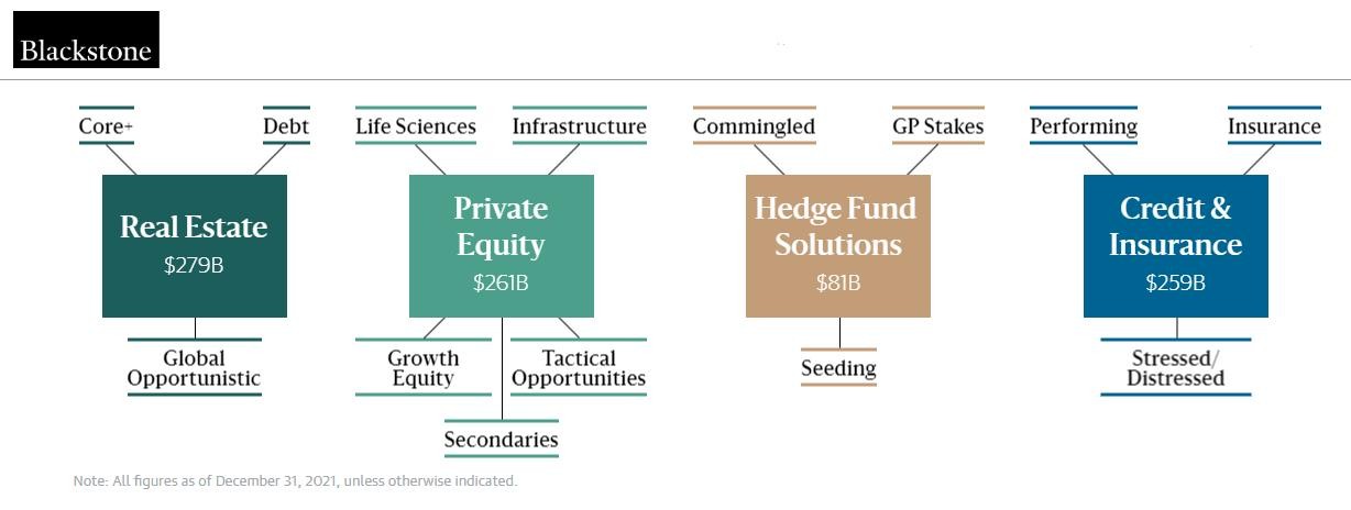 2022年,黑石集团的业务分为四大板块,每一个业务板块分别由数百名投资管理专家组成的投委会管理。