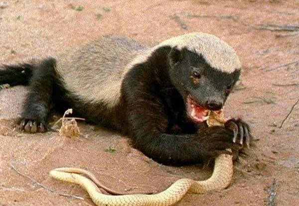蜜獾为什么叫平头哥呢?从外表上看,平头哥,中山装,留着小平头,非白色毛发,长相呆傻,双目有神,一看就是难惹的主,一般动物园都不愿意收留蜜獾平头哥,被眼镜蛇咬后睡两个小时就恢复力量,蜜獾就是动物世界里的爷,它的食谱里从来就没有过不能吃的东西,连眼镜蛇都吃。可以说平头哥是世界上最厉害的动物之一。