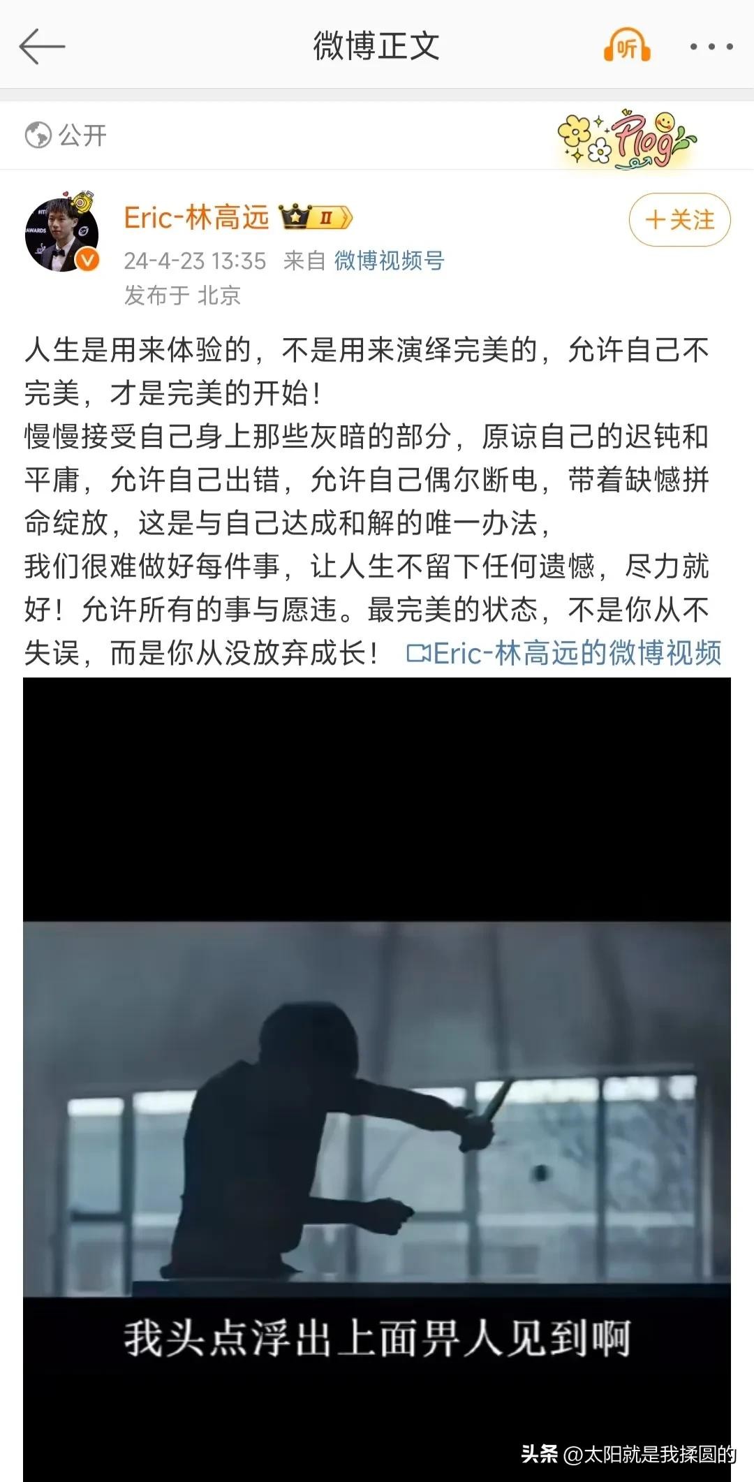 林高远在微博中写道:人生是用来体验的,不是用来演绎完美的,允许自己不完美,才是完美的开始!慢慢接受自己身上那些灰暗的部分,原谅自己的迟钝和平庸,允许自己出错,允许自己偶尔断电,带着缺憾拼命绽放,这是与自己达成和解的唯一办法,我们很难做好每件事,让人生不留下任何遗憾,尽力就好!允许所有的事与愿违。最完美的状态,不是你从不失误,而是你从没放弃成长!