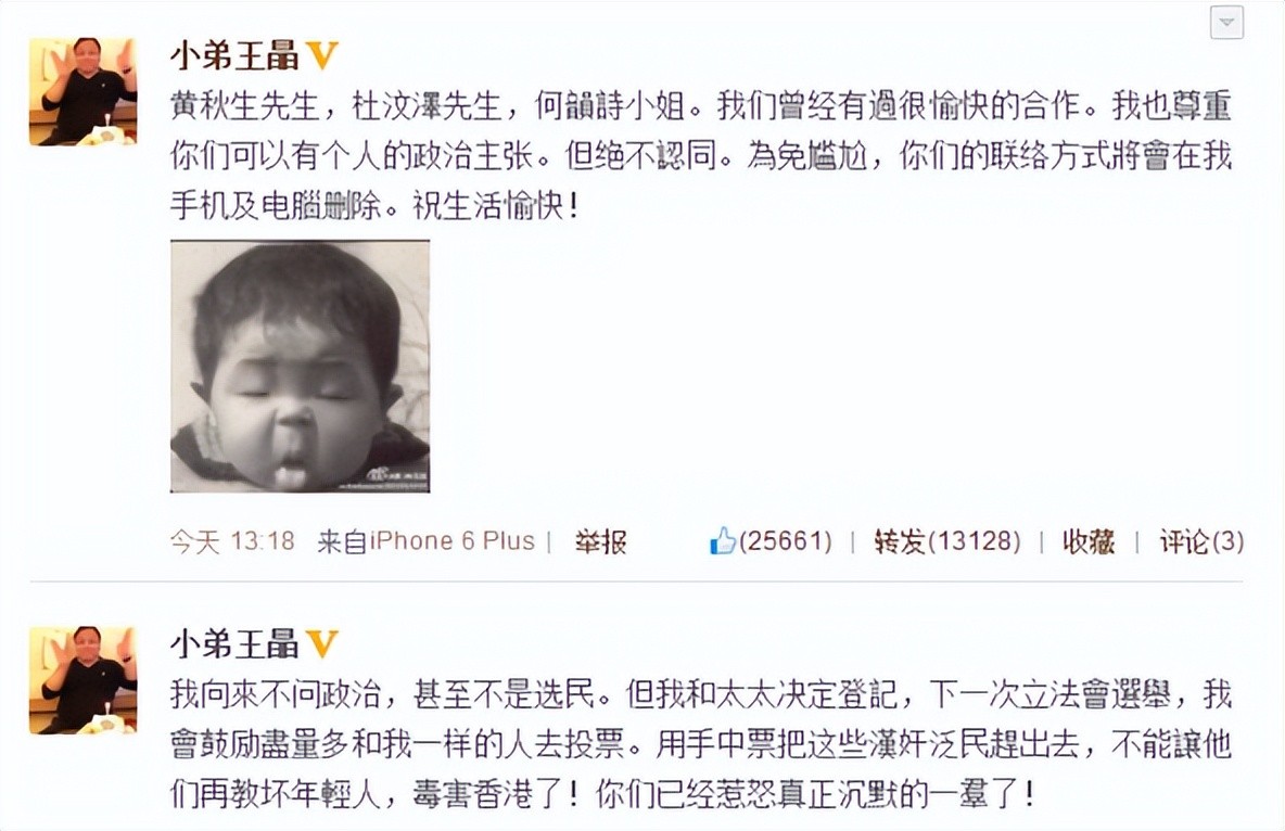 此时香港著名导演王晶在微博上发出了一则声明,这则声明不仅表达了对何韵诗的不满,还中断了之后与何韵诗的合作。