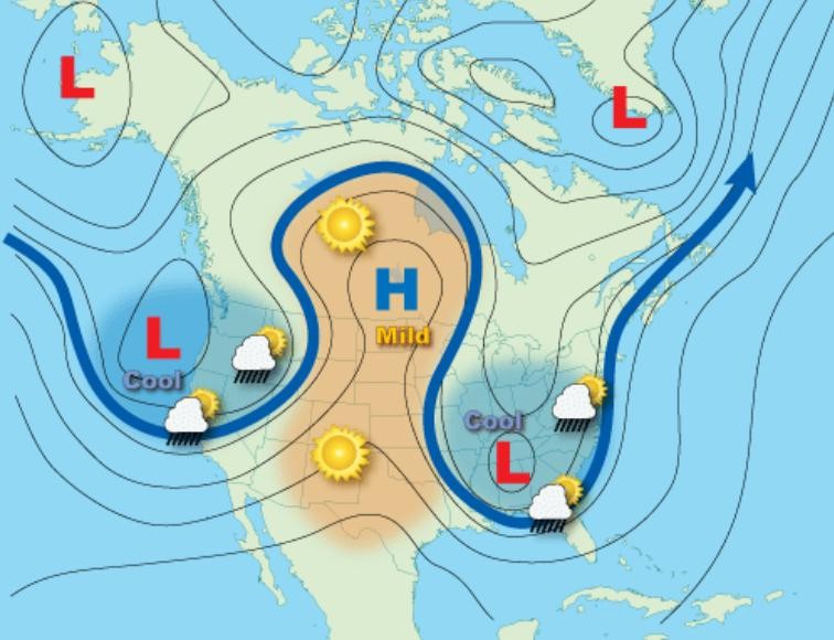 这里除了厄尔尼诺现象外,还有一个重要的原因,就是高压脊的存在。高压脊是指在海拔相同的平面上,如果一个区域的气压高于其他三面,却低于另外一面,就呈现出一个”U”字形状,高压脊内气流辐散下沉。