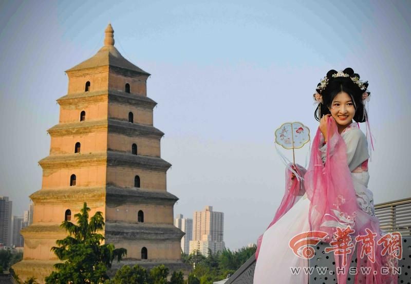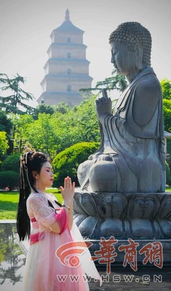 大雁塔作为西安的标志性建筑之一,始终散发着历史的厚重与庄严。4月17日下午4时许,在唐大慈恩寺遗址公园的如来佛雕像前,来自福建省福州的蔡女士对着如来佛祈福许愿。她说,这个角度是她在网上做过攻略的,因为这个角度的前景是拜佛,远处的大雁塔看起来更加特别。来自广东东莞的戴女士却选择在西侧大悦城四楼观景平台拍摄大雁塔。身着汉服和大雁塔一同沐浴在夕阳下,感觉浪漫又温暖。