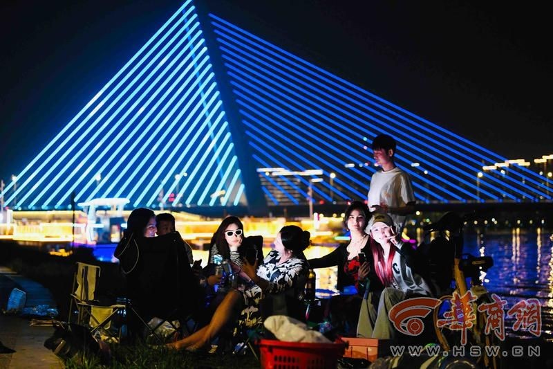 一群年轻人的喧闹声吸引了记者,他们在河边支起露营椅,桌上摆满各种美食,碰撞手中的酒杯,在夜色中肆意又美好,见到记者在拍照,两位女士招手让记者帮他们记录下这美好一刻。