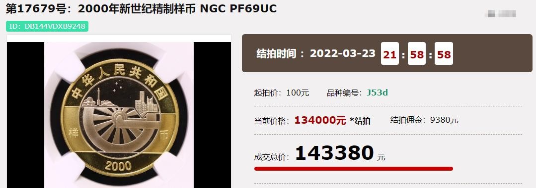 也就是上面这枚2000年新世纪精制样币在前两年的拍卖会上,拍出了14.33万元。