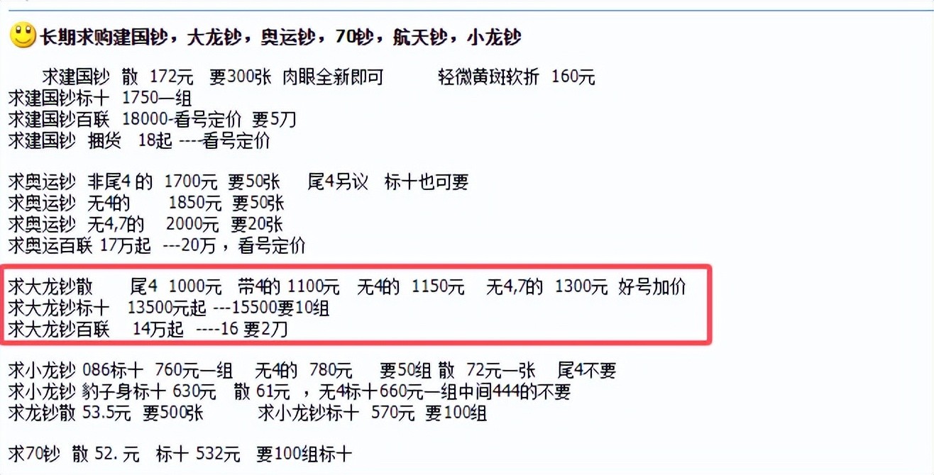 可以看到,现在即使是带4的大龙钞,市场报价也达到了1100元。