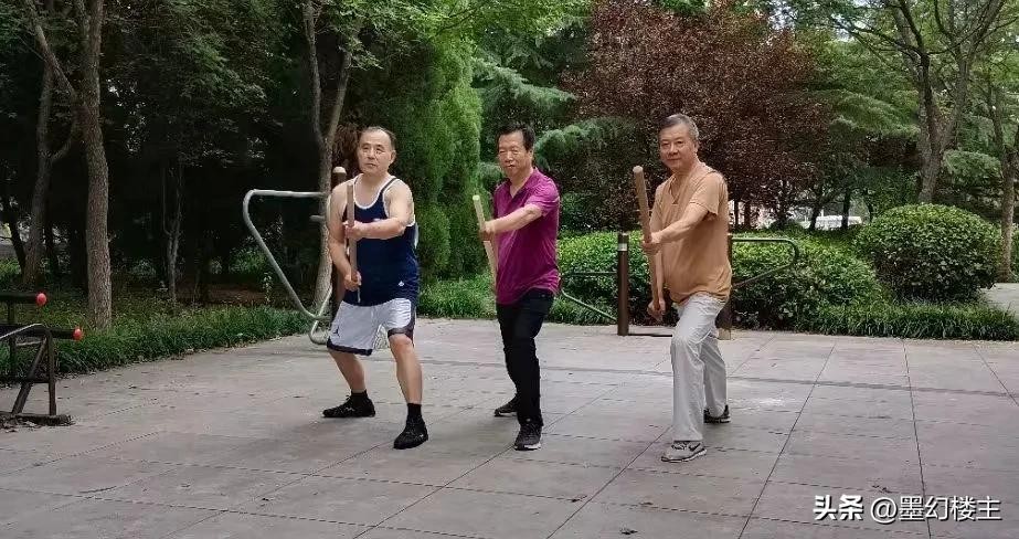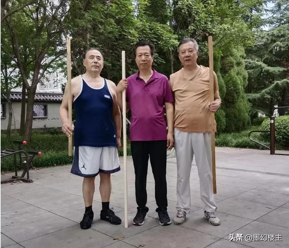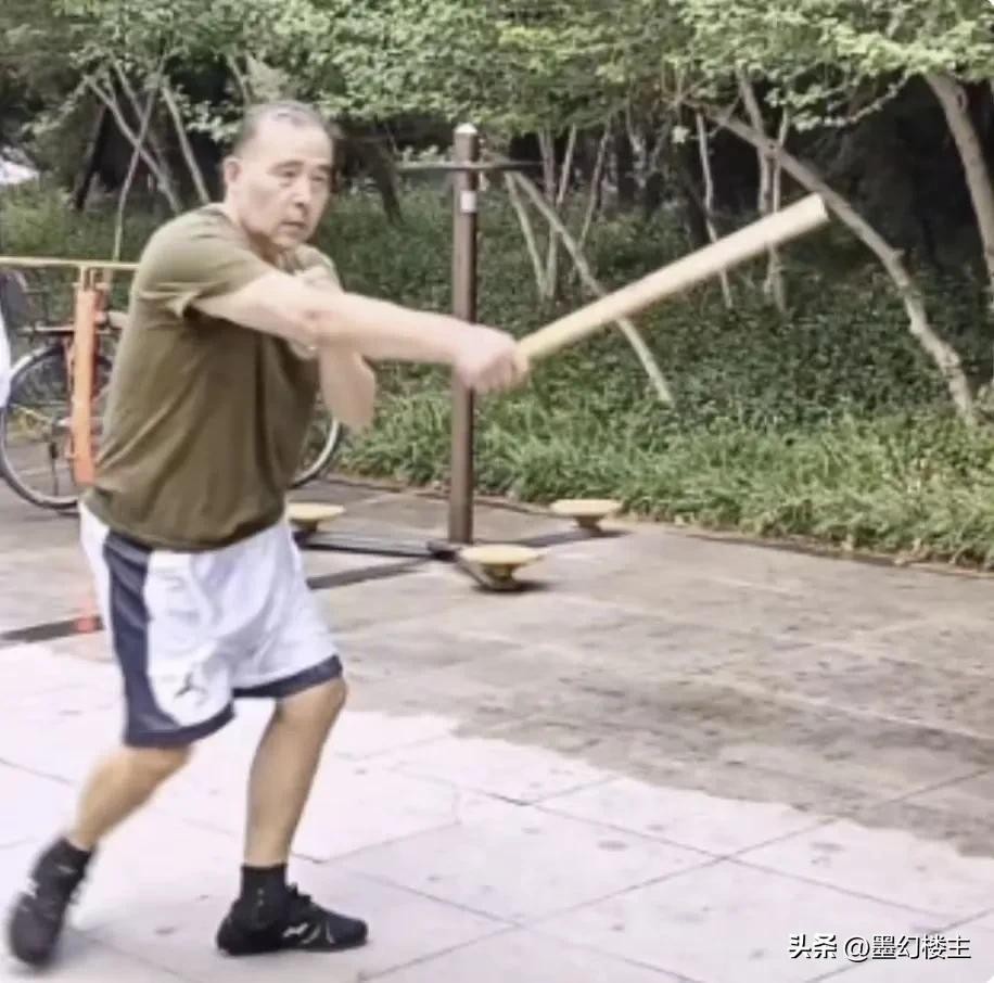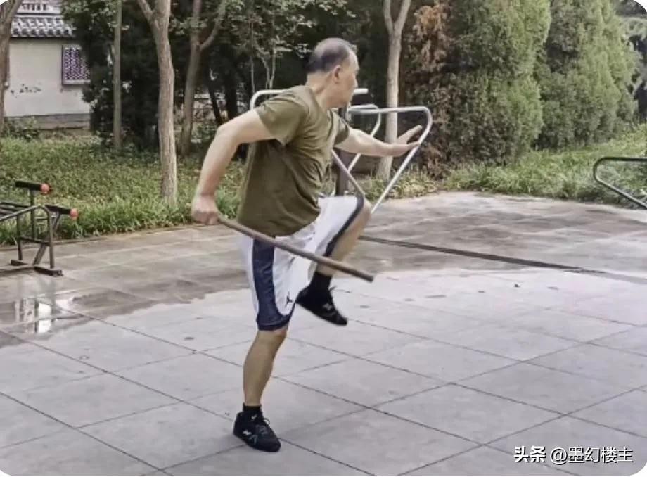听说,练棍老者讲有个绝技,先横扫对手二棍猛一转身,用一个反崩棍打头,当对手防头时一个下撩棍击裆,也可以用后棍头反捅对方腹部。