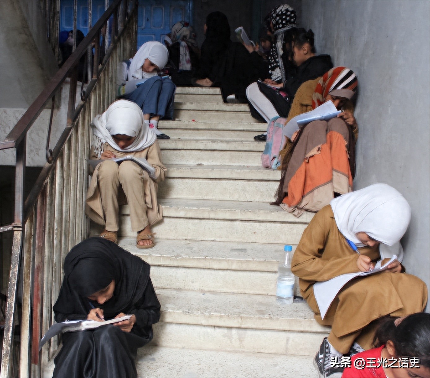 也门的孩子们在楼梯上读书