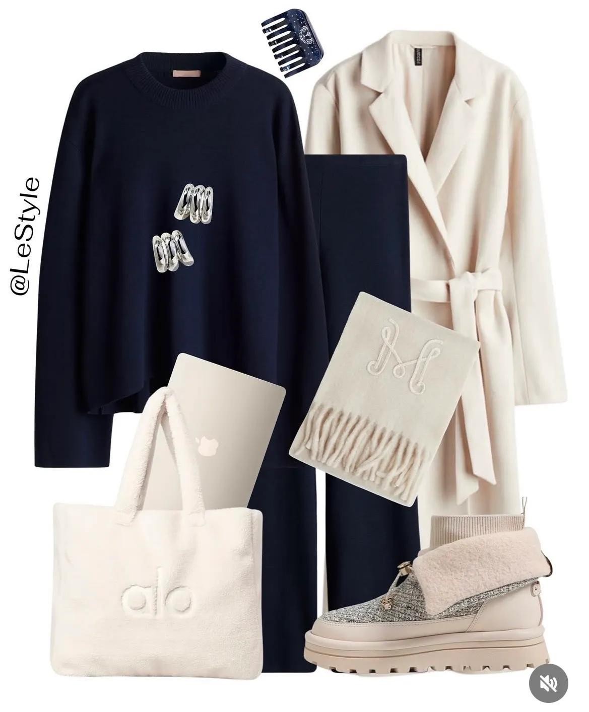 或是回归舒适风,海军蓝的针织套装,跟浅白大衣相互映衬很大气,柔软针织又特别舒适,穿出很惬意的美感。