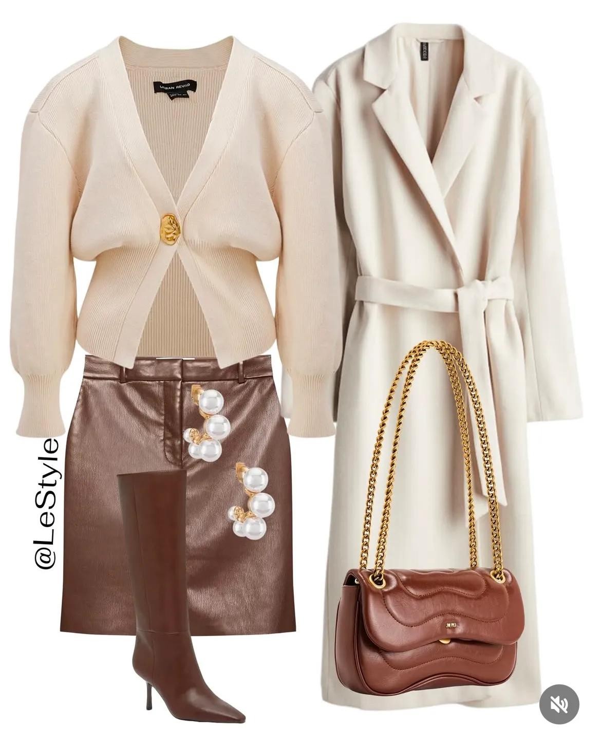 白色大衣天生就有洋气女人味,可以在搭配上放大这一点,轮廓立体的白色开衫,勾勒几分随性又精致的感觉,而一条皮质半裙配长靴,则借助皮质把咖色展现得很有高级感,绝对能穿得出彩。