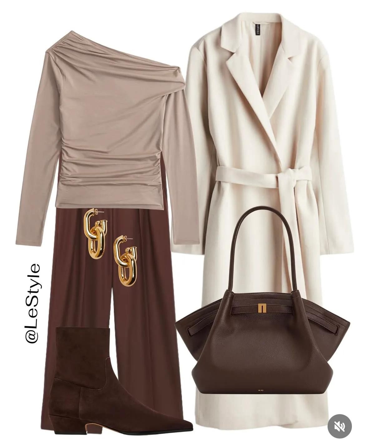 而加入点妩媚元素,斜肩剪裁的真丝小衫,自然在领口处形成波浪纹理。以垂坠面料长裤搭配,再点缀金色耳环,咖色+白色的洋气组合继续能发挥魅力。