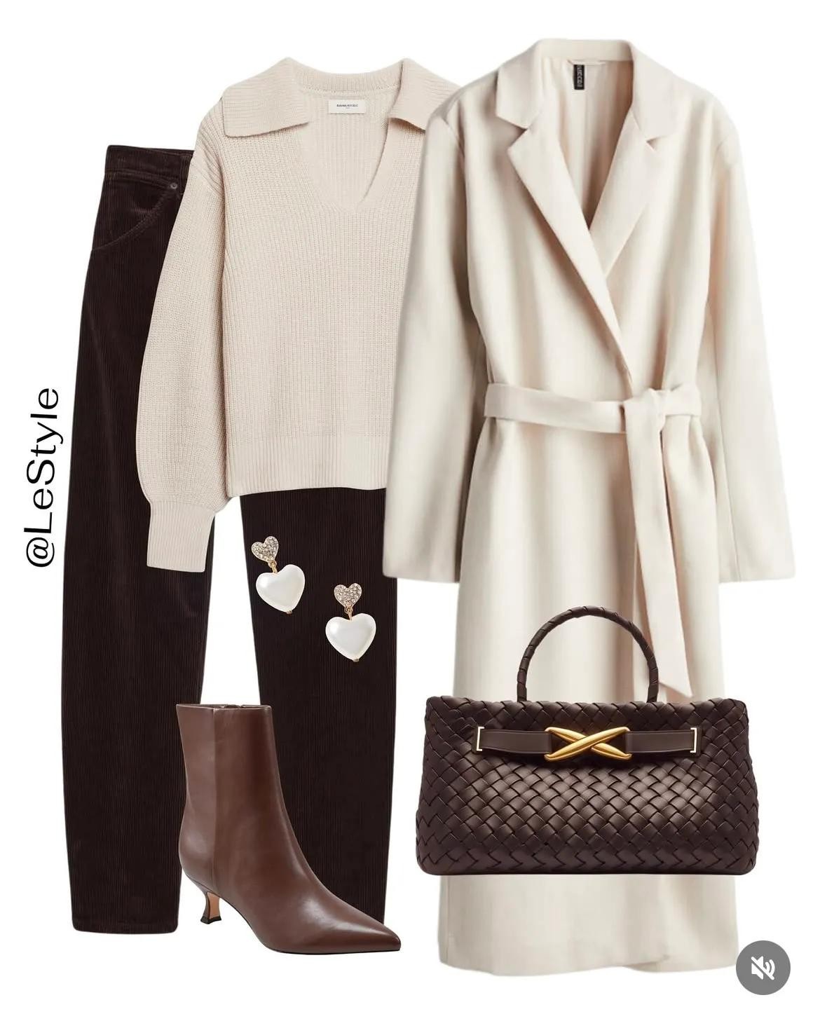 白色大衣要选窄版剪裁配腰带,长度到小腿位置,才能起到显身材又大方的效果。就用同色系大翻领毛衣呼应,再配深巧色牛仔裤,哪怕只是换不同风格的短靴,也能穿得亮眼好看,可以说是省事也时尚的搭配法了。