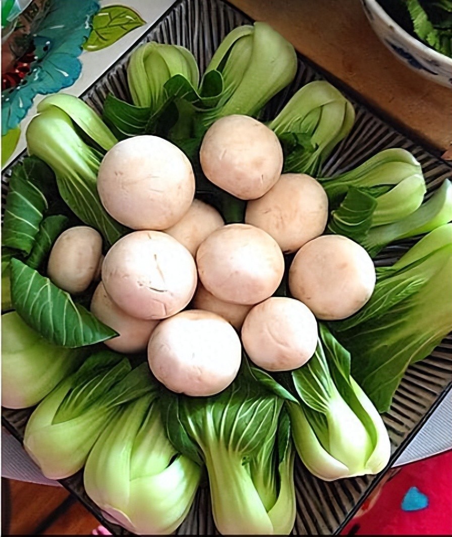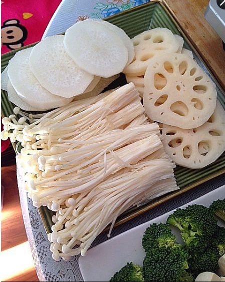 金针菇切掉根部洗净、大白萝卜去皮切片、莲藕去皮切片摆盘