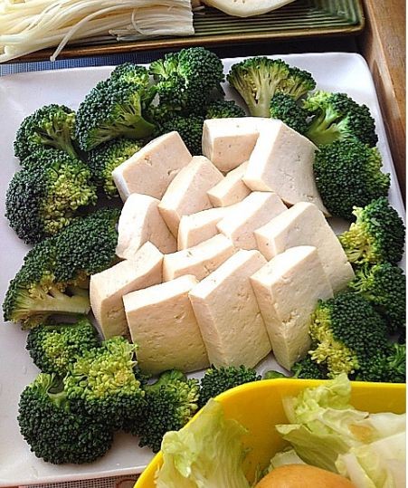西兰花用淡盐水清洗好,豆腐切片摆盘