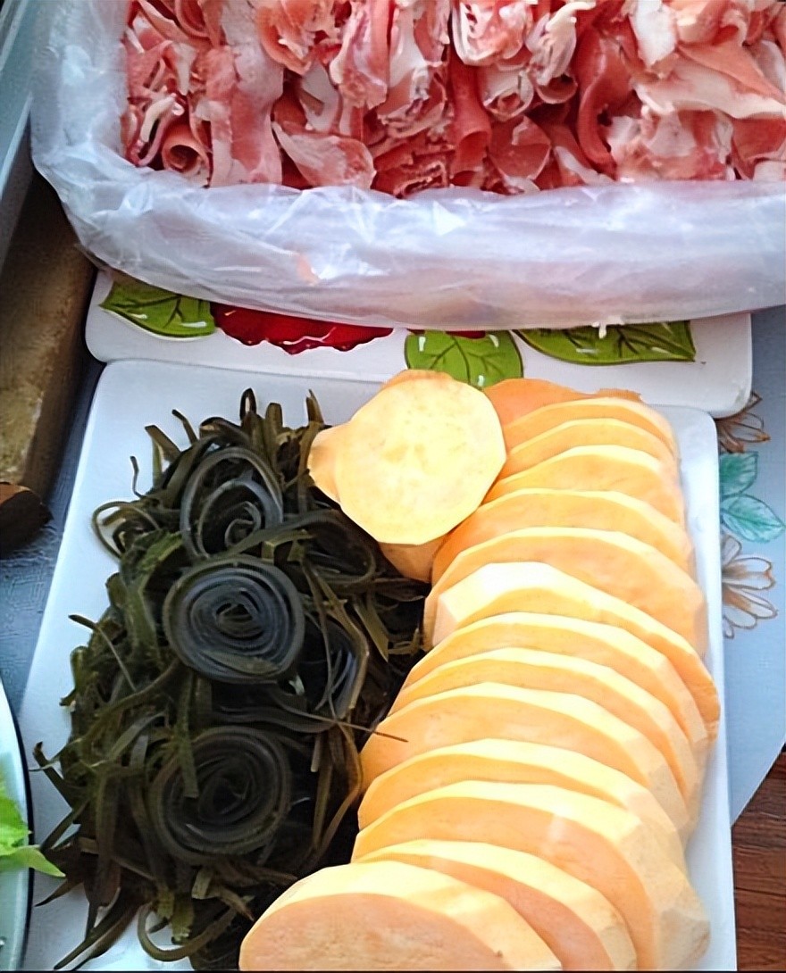 红薯去皮切片(稍微厚一些)、海带切宽片