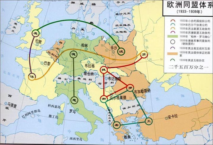 在二战的所有参战的大国中,斯大林领导的苏联开局是最差的两个之一(还有一个是我们中国),苏联的地理位置首先就不好,苏联的东边有德国和波兰,东边有日本,更要命的是这三个国家都曾经击败俄国。日本和德国还是法西斯盟友,这让苏联腹背受敌。苏联独特的意识形态,导致苏联在国际上盟友任何盟友。二战前的世界国际秩序的主导者英法,他们是非常愿意见到苏联与法西斯发生冲突,所以英法在二战前的战略就是不断推行绥靖政策,祸水东引。就这样一个松散的反苏联盟就诞生了。苏联的战略空间不断受到挤压。