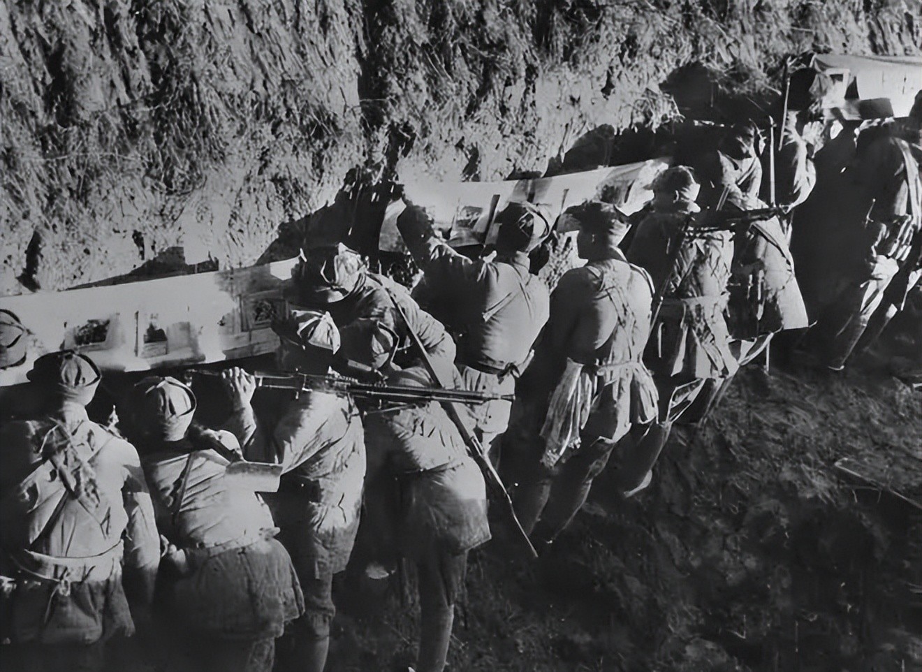面对敌人的严密防守,解放军并没有选择放弃或退缩。战士们迅速改变了战术,决定放弃石桥,改为绕过桥头,在多个地点同时架设简易桥梁来渡过这道水沟。几分钟内,十几名勇敢的战士扛着木板跃入了刺骨的河水中。他们毫不犹豫地用自己的身体做支撑,让木板稳固,为后续的战友提供过河的通道。