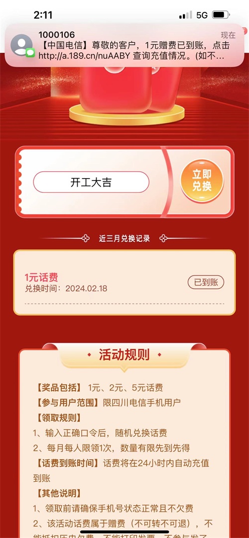 【领取方式】获取链接后在活动页面输入 开工大吉,即可获得随机话费