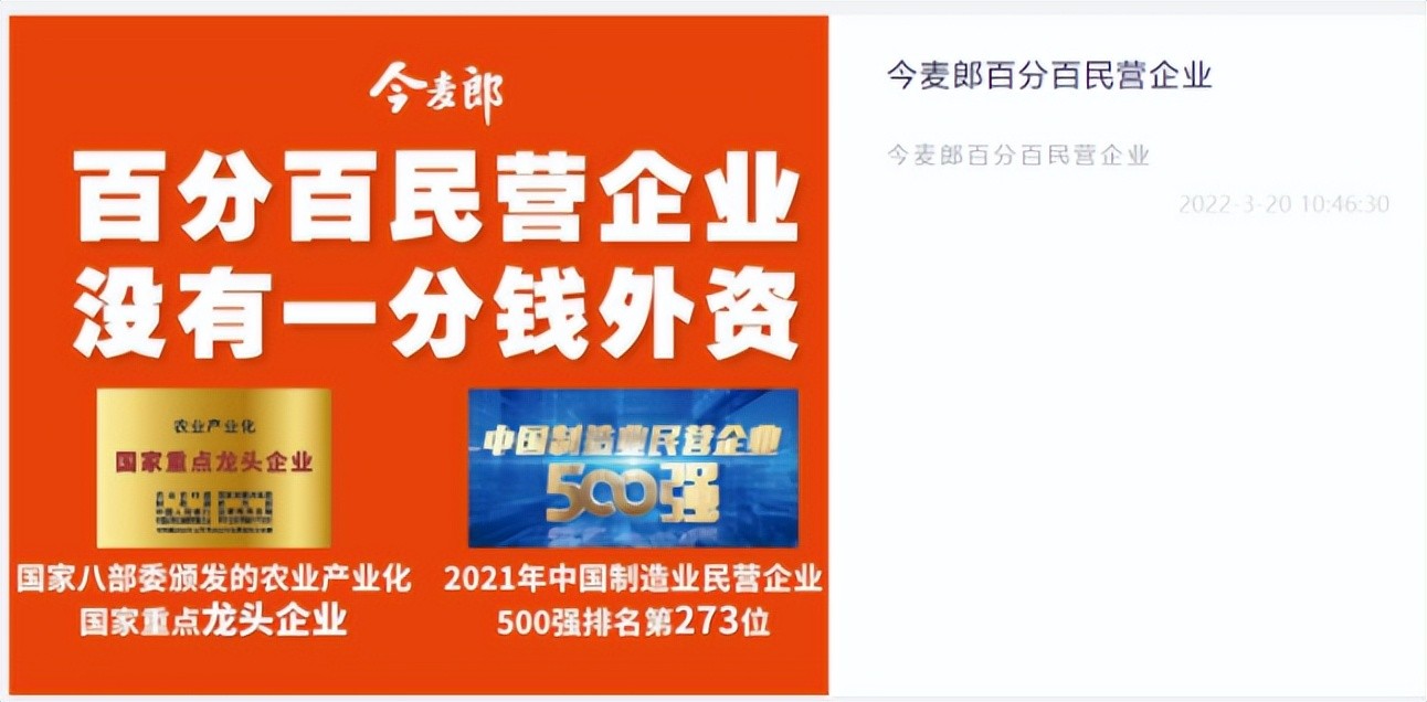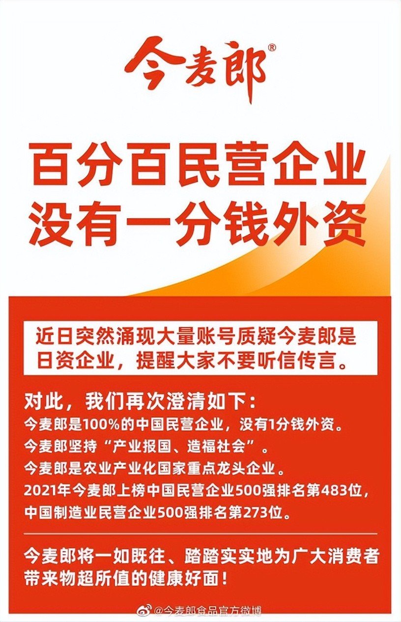 3月19日今麦郎发微博表示,“近日突然涌现大量账号质疑今麦郎是日资企业,小麦我不得不亮出‘身份证’了。”并附图片表明自身百分百中国民营企业的身份,没有一分钱外资,提醒消费者不要被误导。