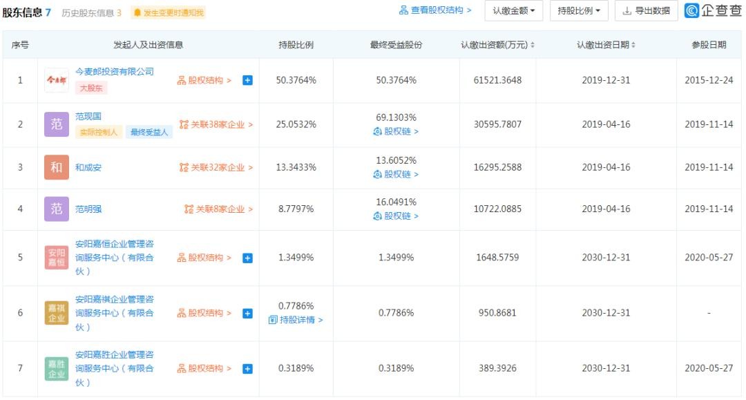 从企查查看到,今麦郎食品股份有限公司股东共7名,其中今麦郎投资有限公司为大股东,持有50.3764%股份;实控人范现国直接持有今麦郎25.0532%股份;其余5名股东为两名自然人和三家合伙企业。