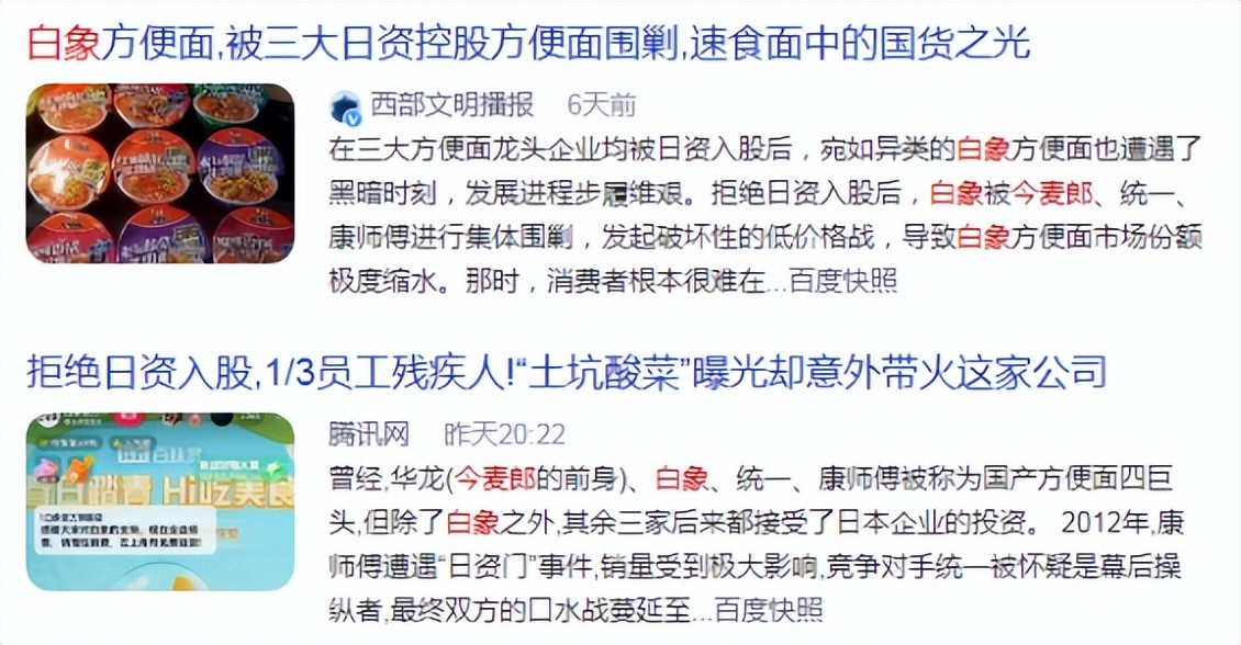 在白象回应这句话之后,引发网友们对方便面巨头康师傅、统一、白象等企业背景的人肉,发现康统虽是中国台企,但是背后却是日资。而白象曾强力拒绝日资入股,并成为中国从开始到现在唯一一个没有被日资控股的方便面巨头。随后,网络大量有类似观点的文章中,今麦郎无辜躺枪。