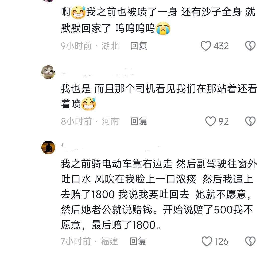 评论区网友直接表示:发生了这种事情,对这两个人造成的伤害有多大,知道吗?就想着拿这900块钱来打发人啊,这有点不当人看了呀,想想当年,我走路上被洒水车喷了一身,全身都是沙子和泥,我都讹了他一千块钱呢,别说是你们身心都收到了严重创伤,这可不是钱能弥补得了的啊。