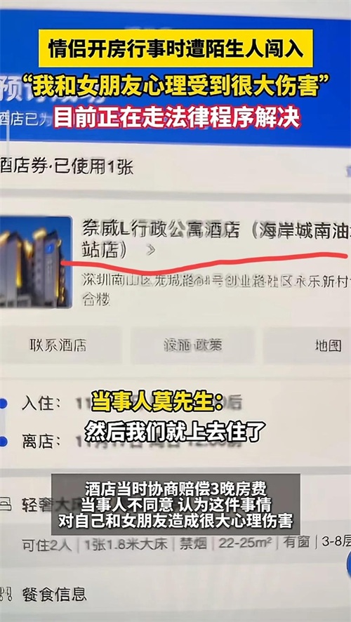 于是莫先生就去找到酒店方理论,没想到酒店方不但没有正面回应,也没有给出任何的解决方案,就想着先安抚人,让其先去休息,后来经过与酒店协商,酒店方说给莫先生赔三个晚上的房费,这种处理态度,莫先生接受不了,毕竟莫先生和女朋友收到了严重的心理伤害,于是决定走法律程序解决这个问题。