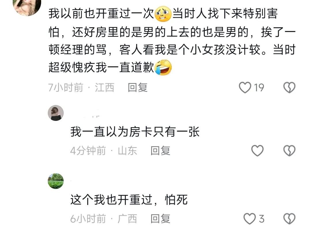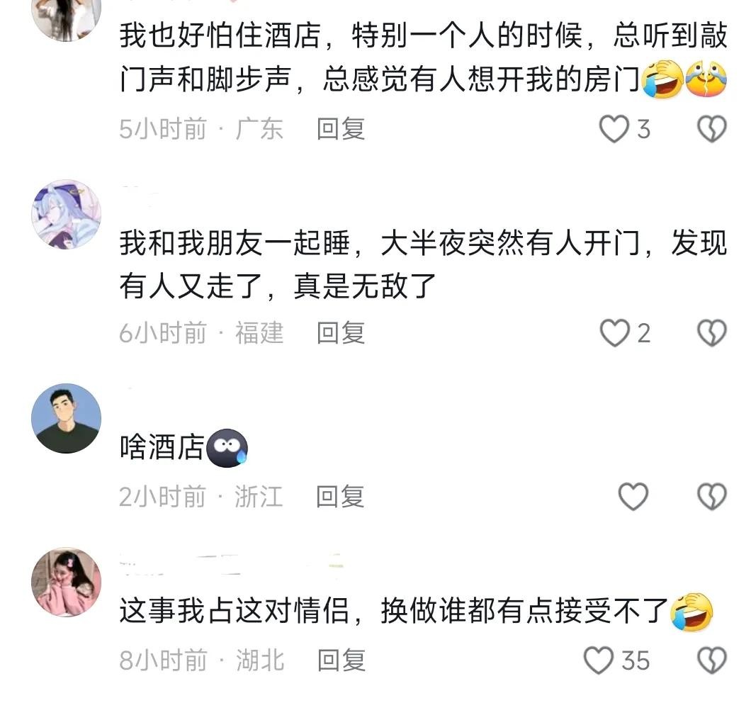 还有另外一位网友表示:怎么又是深圳啊,这我可就有话要说了,这样的经历我也有,当时是在早上呢,我和我的老公还在房间里面睡觉,突然就有人刷房卡要开门进来,好在晚上睡觉前把那个链条给卡住了,他进不来,我俩睡眠比较浅,一下子就被惊醒了,我老公就一把抱住了我,对着门外的人喊了几句,后来那个人道歉就离开了,去找酒店理论,酒店也是什么都不想管,说是我们没有任何损失,这件事就是这样,真是把人给气得不行。