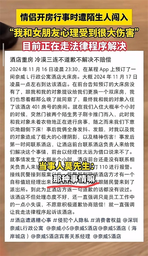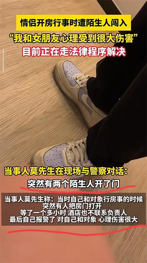据当事人莫先生讲述:当时他和他的女朋友在某酒店开房,当时订的大床房没有了,于是给他们安排了一个双人床,就上去住了,他们到酒店入住后才不到半个小时的时间,没想到酒店竟然又把他们的房间开给了别人,所以在他和女朋友正在做着某些运动,谁知道这个时候,突然闯进来了两个陌生人,这可把他们两个给吓得不轻,毕竟正在做着那种事情被惊吓到,两个人当场就摔到了床下去了,这给莫先生和他的女朋友的心理造成了极大的伤害,估计都要留下心理阴影了。