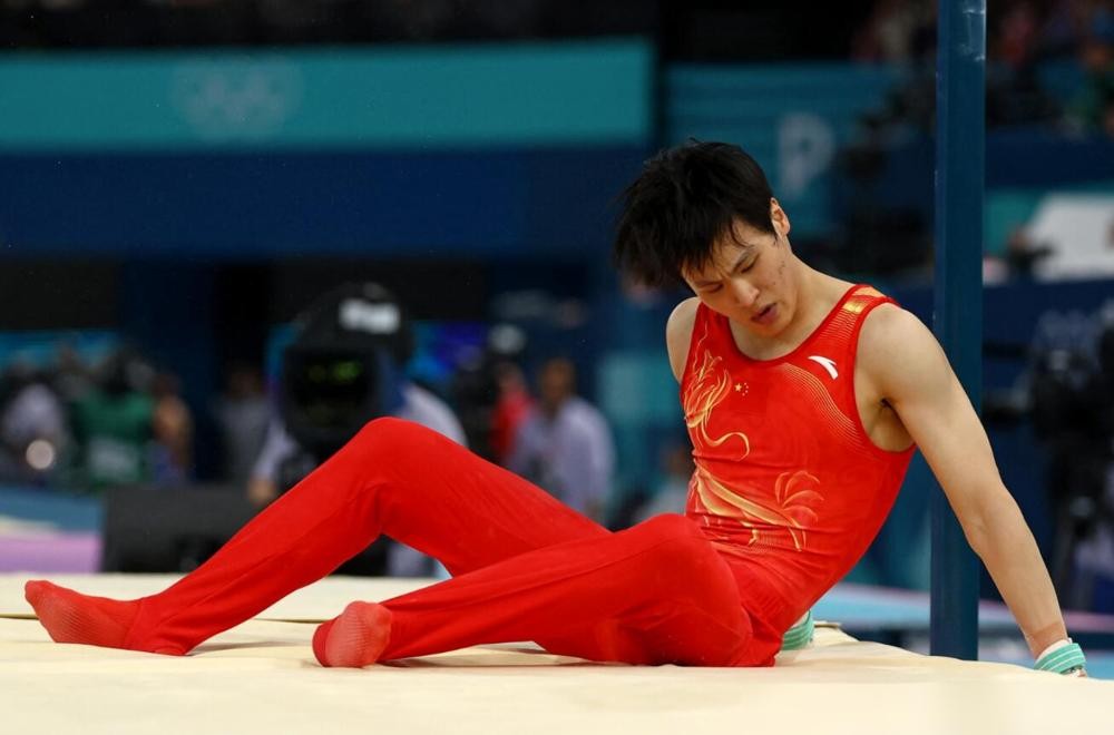 日本的选手在单杠上的表现不算出色,但是中国队的选手却跌得更惨,中国队的队员苏炜德在自由体操的比赛中掉杠。