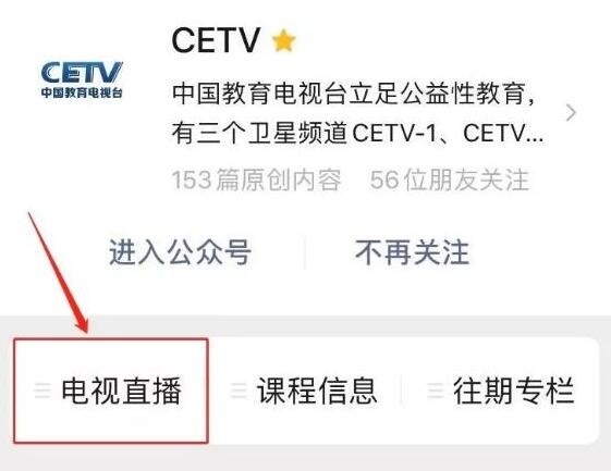 进入CETV公众号后,可以看到如下画面,点击电视直播后即可进入直播间开始观看。