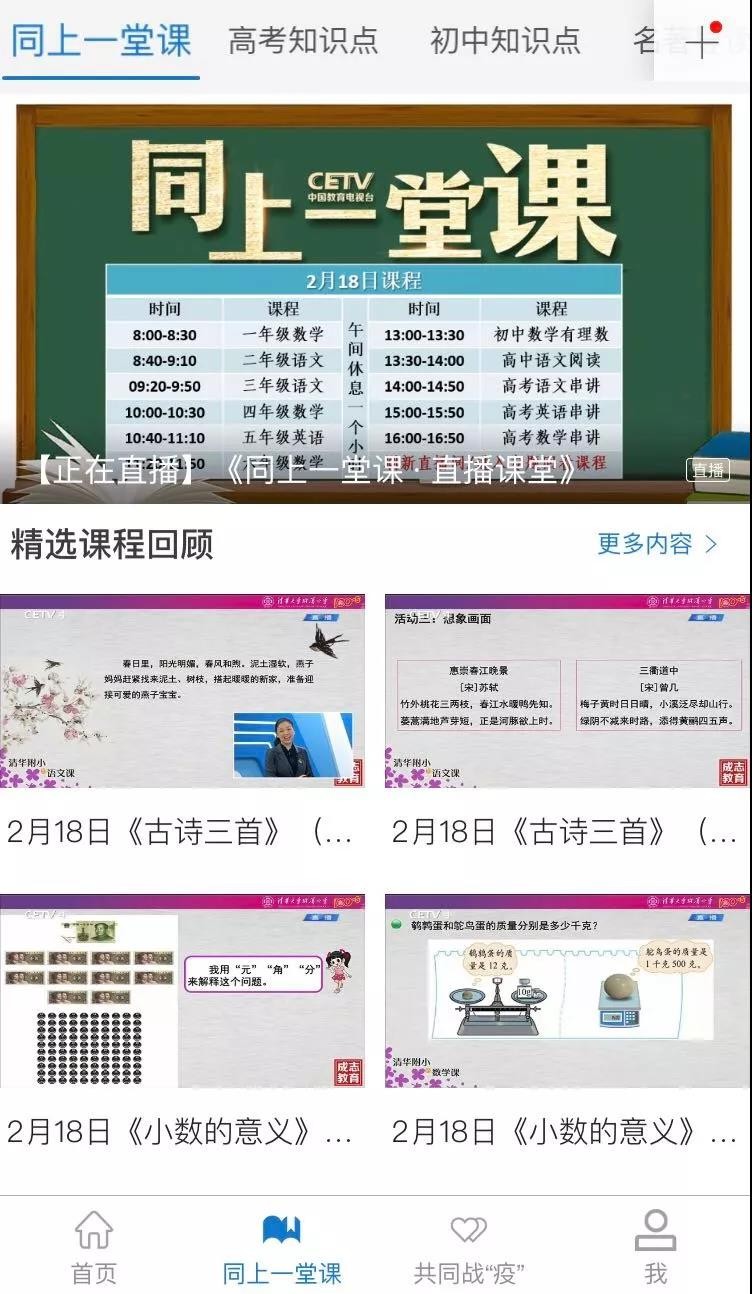 中国教育电视台四频道CETV4周一至周五推出《同上一堂课·直播课堂》,供同学们根据需要自由选择,自主学习。目前全国的电视观众可以通过有线电视网络或IPTV平台收看到中国教育电视台四频道,具体频道号请咨询当地的有线网络公司。此外在疫情防控期间,直播卫星平台特别新增传输中国教育电视台四频道讯号,户户通频道号为52,村村通频道号为55。